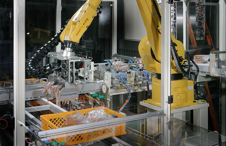 In every instance where particular requirements make it necessary we use robots to resolve special packaging assignments. Our main expertise lies in the equipment of standard commercially available robots from renowned manufacturers with specially adapted tools to handle and pack your products carefully. The control system for the complete movement sequence is developed and followed up exclusively by experts from our company.