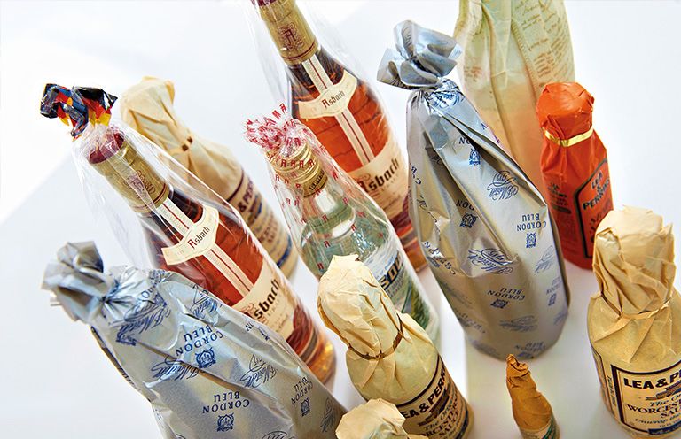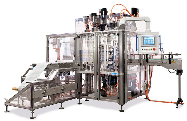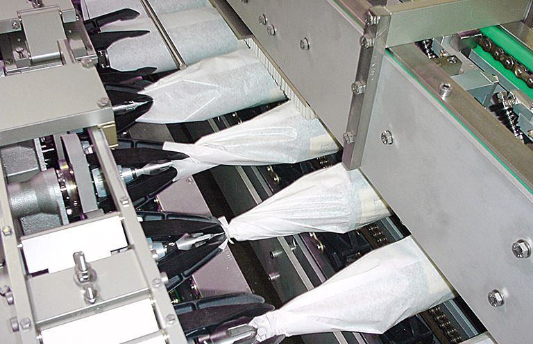 Tubular wrapping of the bottles, which are fed continuously through the machine, is performed first. Neck and base twisting heads follow the bottles as they move, grab the excess material at the edge and twist it. Alternatively, it is also possible to perform a fold at this point. In the final step, an erecting station carefully returns the bottles to an upright position before they leave the machine fully wrapped. In the medium capacity sector – with an output capacity of 3.000 bottles per hour – the products are moved upright through the machine (vertically). Whether they are bottles, sugar loaves or other hard products to be wrapped, an infeed starwheel performs indexing of the products first.